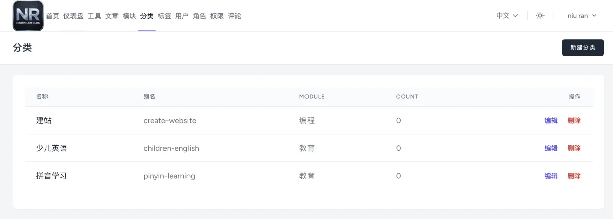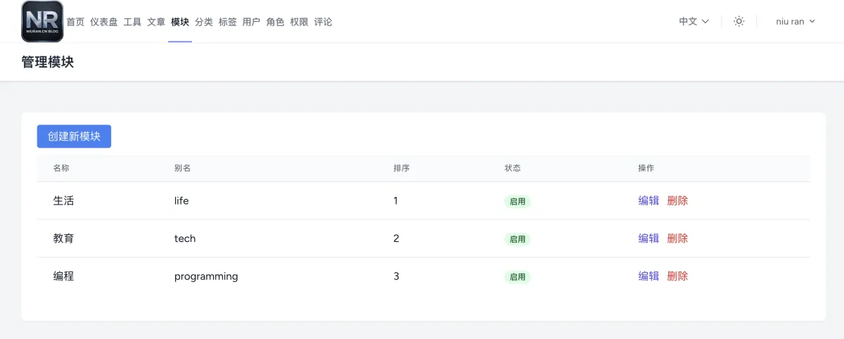 模块管理:模块会自动添加到顶部导航栏,作为菜单显示。如:生活、教育、编程。